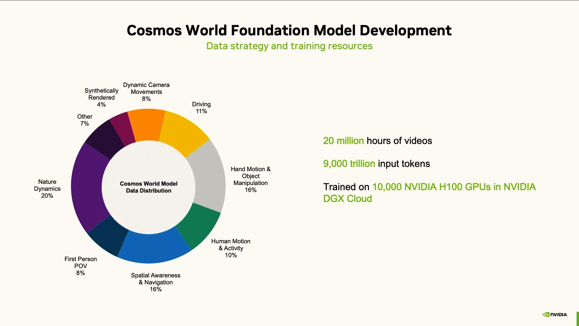 Согласно данным, опубликованным NVIDIA в январе 2025 года на CES, модели Cosmos были обучены на 20 миллионах часов видео и 9 триллионах (не миллиардах) токенов. Для обработки такого объёма данных использовались тысячи видеокарт H100, а на платформе Blackwell эта задача может быть выполнена за 14 дней.