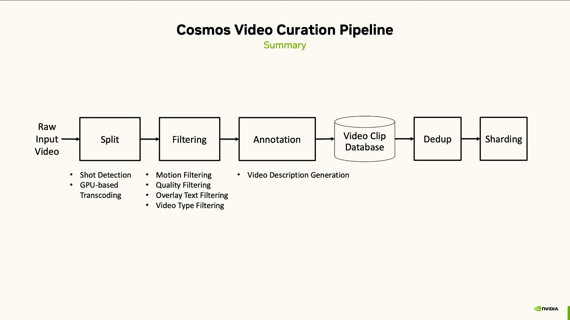 Звучит круто, но сырые данные машине не скормить. Их надо сначала приготовить. Поэтому в NVIDIA построили полноценный конвейер для автоматической обработки, очистки и разметки видеоданных. Видео разбили на фрагменты, вырезали скучное, некачественное и лишнее. Оставшееся разметили, добавили описания, перевели в понятный для машин формат — токенизировали.