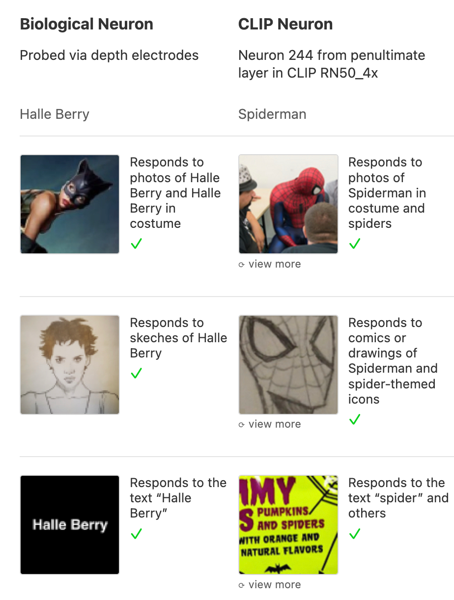 В 2021 году при исследовании модели CLIP были обнаружены мультимодальные нейроны, аналогичные знаменитому «нейрону Хэлли Берри», найденному в мозге человека ещё в 2005 году. Этот биологический нейрон активировался при виде фотографий актрисы, рисунков и даже текста с её именем.