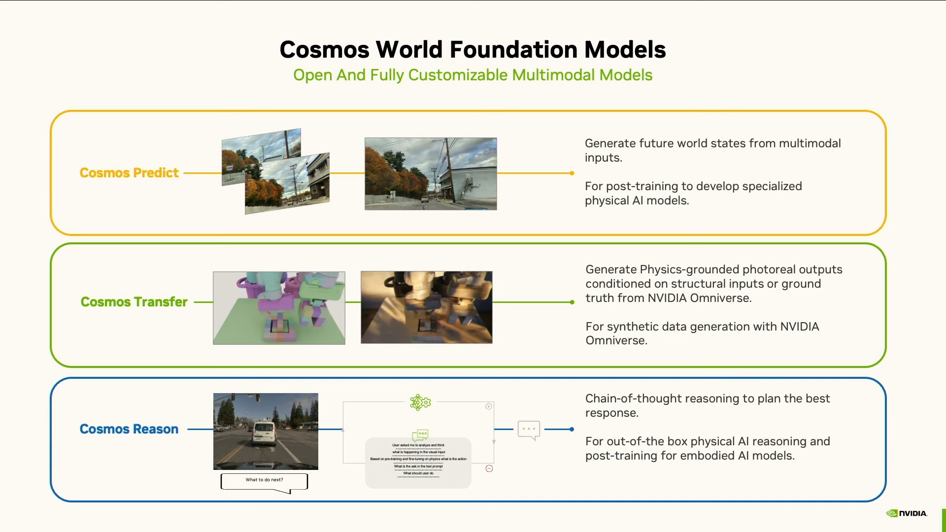 NVIDIA Cosmos — это открытая платформа для разработки физического ИИ, представленная на CES 2025 и значительно расширенная на GTC 2025 в марте того же года.
