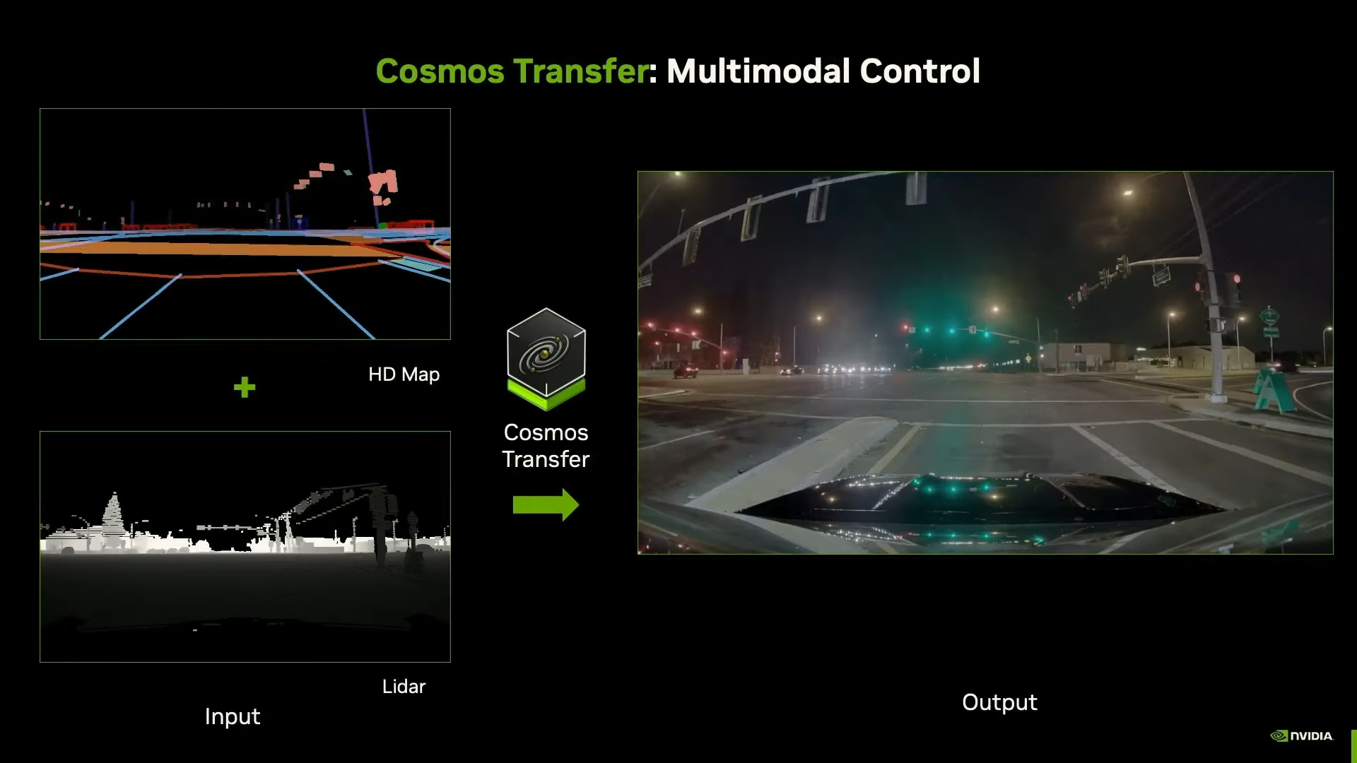 Cosmos Transfer. Если Predict придумывает, что будет, то Transfer отвечает за реализм. Эта модель превращает любые видеоданные в живую картинку. Есть только данные с лидара? Не проблема — Transfer насыпет реализма. Вот тебе: день, ночь, снег, дождь, блики, грязь — сама суровая жизнь во плоти.
