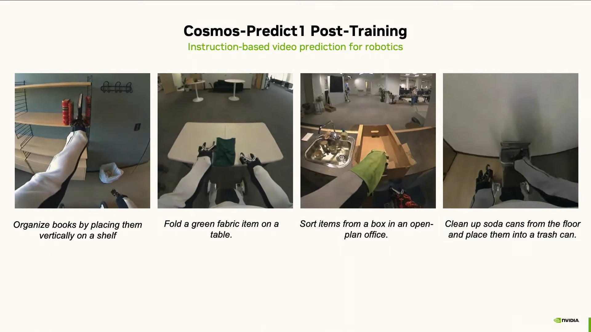 Cosmos Predict — это сценарист снов. Он позволяет переиграть уже прожитый опыт разными способами. Например, если андроид во время испытания не смог поставить книжку на полку, сложить полотенце, сортировать посуду или выкинуть мусор — не беда! Cosmos Predict позволит переиграть эти воспоминания и сгенерировать образцовые материалы для обучения.