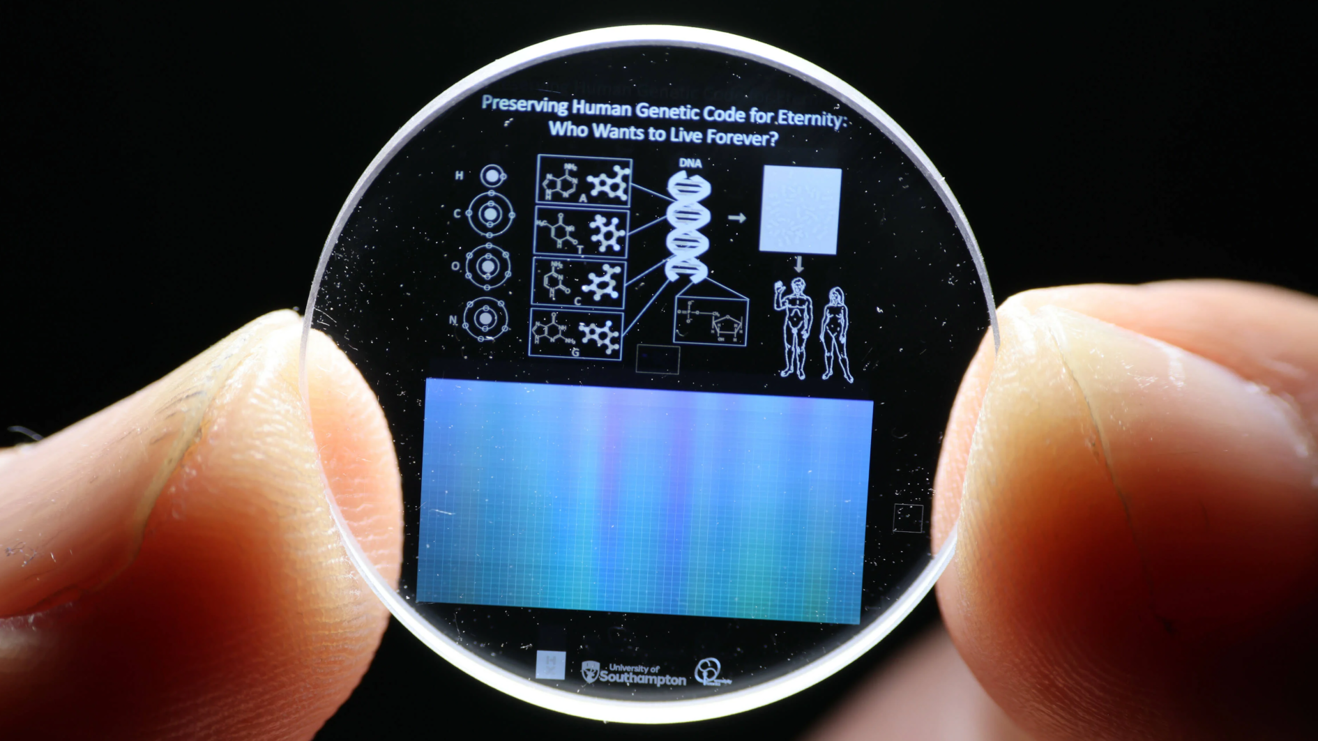 В 2024 году на 5D-кристалл записали полный геном человека — трёхмиллиардную последовательность ДНК на кристалле размером с монету. Диск даже получил гравировку визуального ключа для будущих расшифровщиков. Сейчас этот «генетический диск» хранится в австрийском архиве «Память человечества».