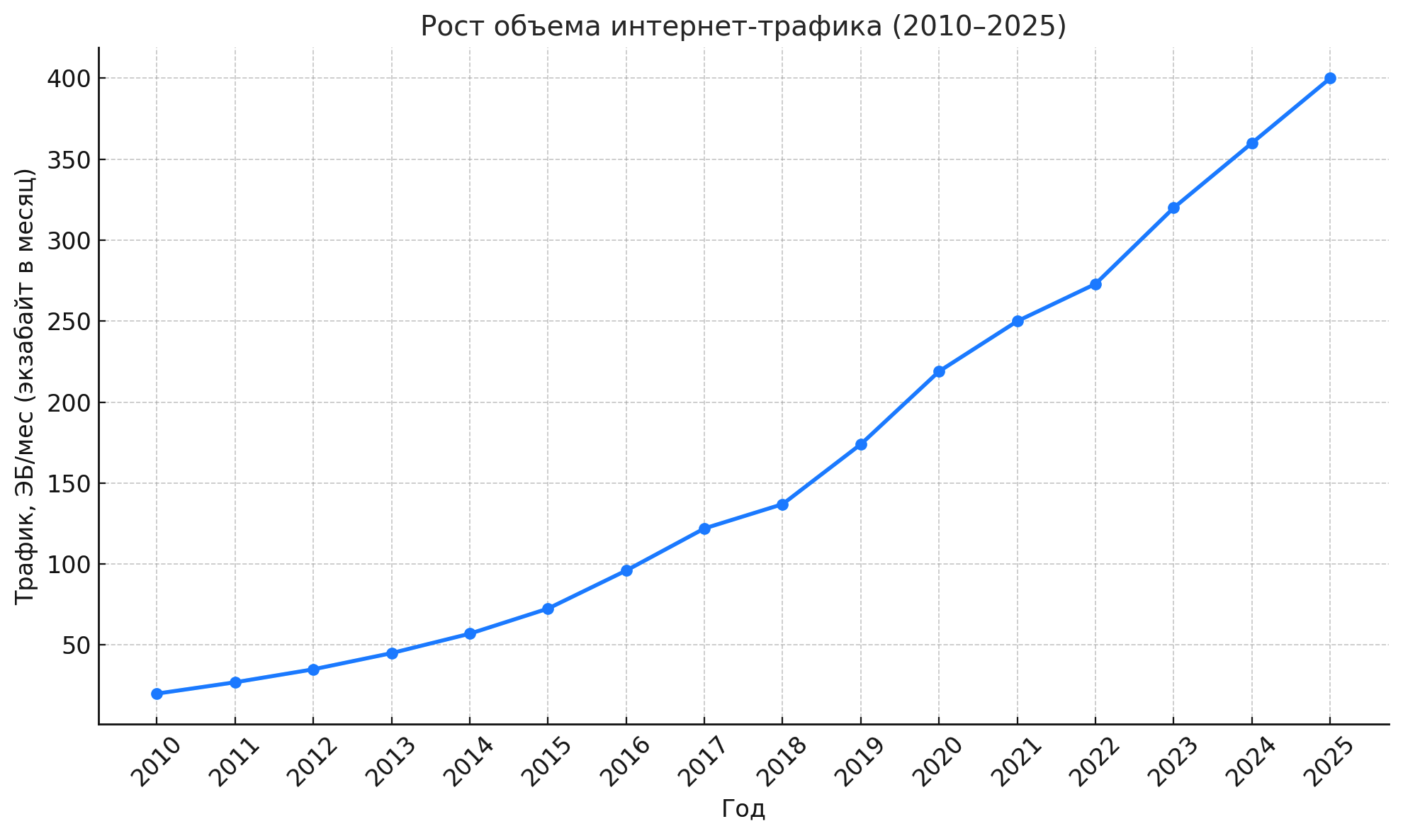 Тридцать лет назад весь интернет занимал всего 2,5 терабайта — такой объём сегодня легко помещается на обычный внешний жёсткий диск. Но мир изменился. По данным на 2024 год, глобальный интернет-трафик достиг 521,9 экзабайта в месяц, а прогнозы указывают на продолжение экспоненциального роста.