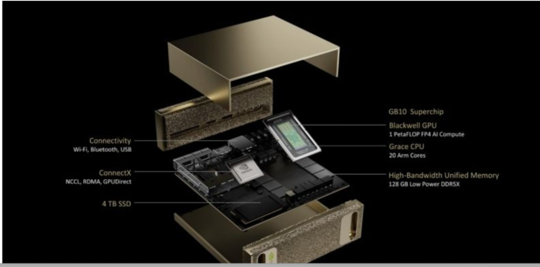 GB10 объединяет графический процессор на архитектуре Blackwell — с новейшими ядрами CUDA и тензорными ядрами пятого поколения — и центральный процессор Grace с двадцатью энергоэффективными ядрами на базе архитектуры Arm (10 высокопроизводительных ядер Cortex-X925 и 10 энергоэффективных Cortex-A725). Соединяет их технология NVLink-C2C, обеспечивающая пропускную способность в пять раз выше, чем интерфейс PCIe Gen 5. Унифицированная архитектура памяти означает, что процессор и графический сопроцессор совместно используют единый пул из 128 ГБ — без накладных расходов на копирование данных между раздельными банками.