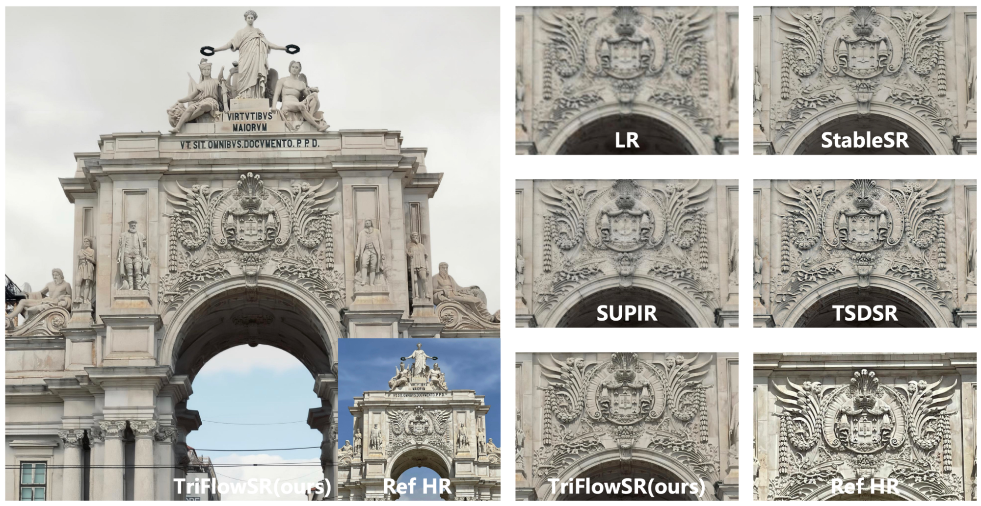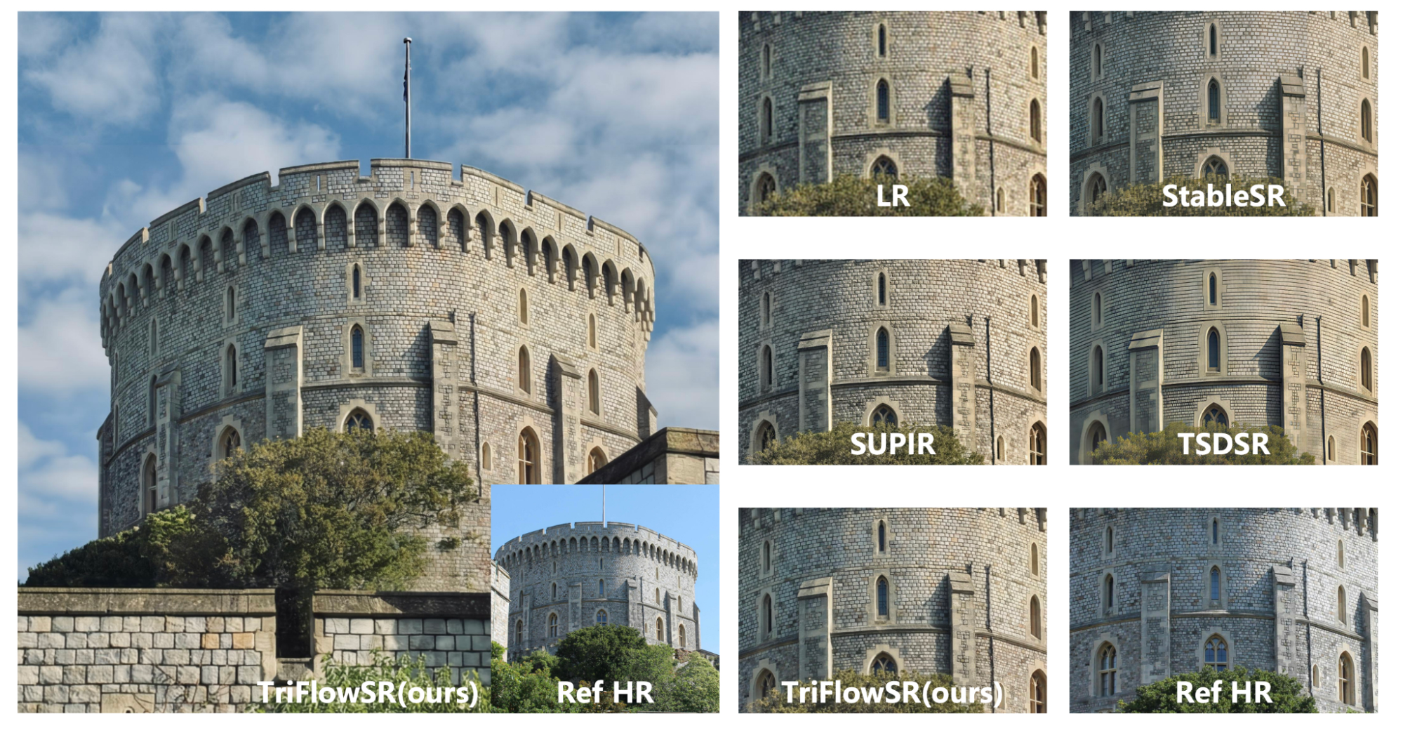 TriFlowSR (Ultra-High-Definition Reference-Based Landmark Image Super-Resolution with Generative Diffusion Prior) — узкоспециализированный алгоритм сверхразрешения, предназначенный исключительно для архитектурных объектов.