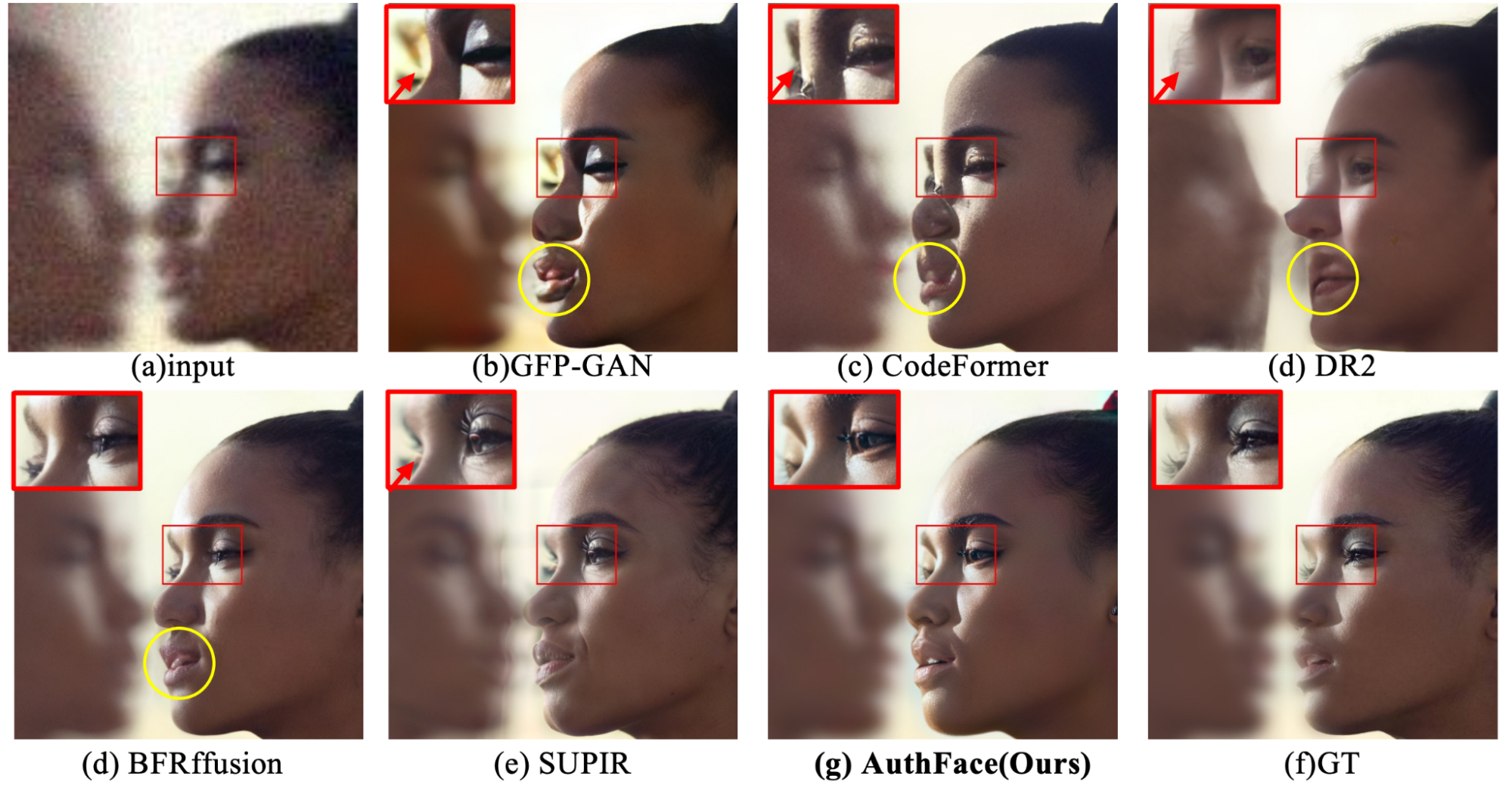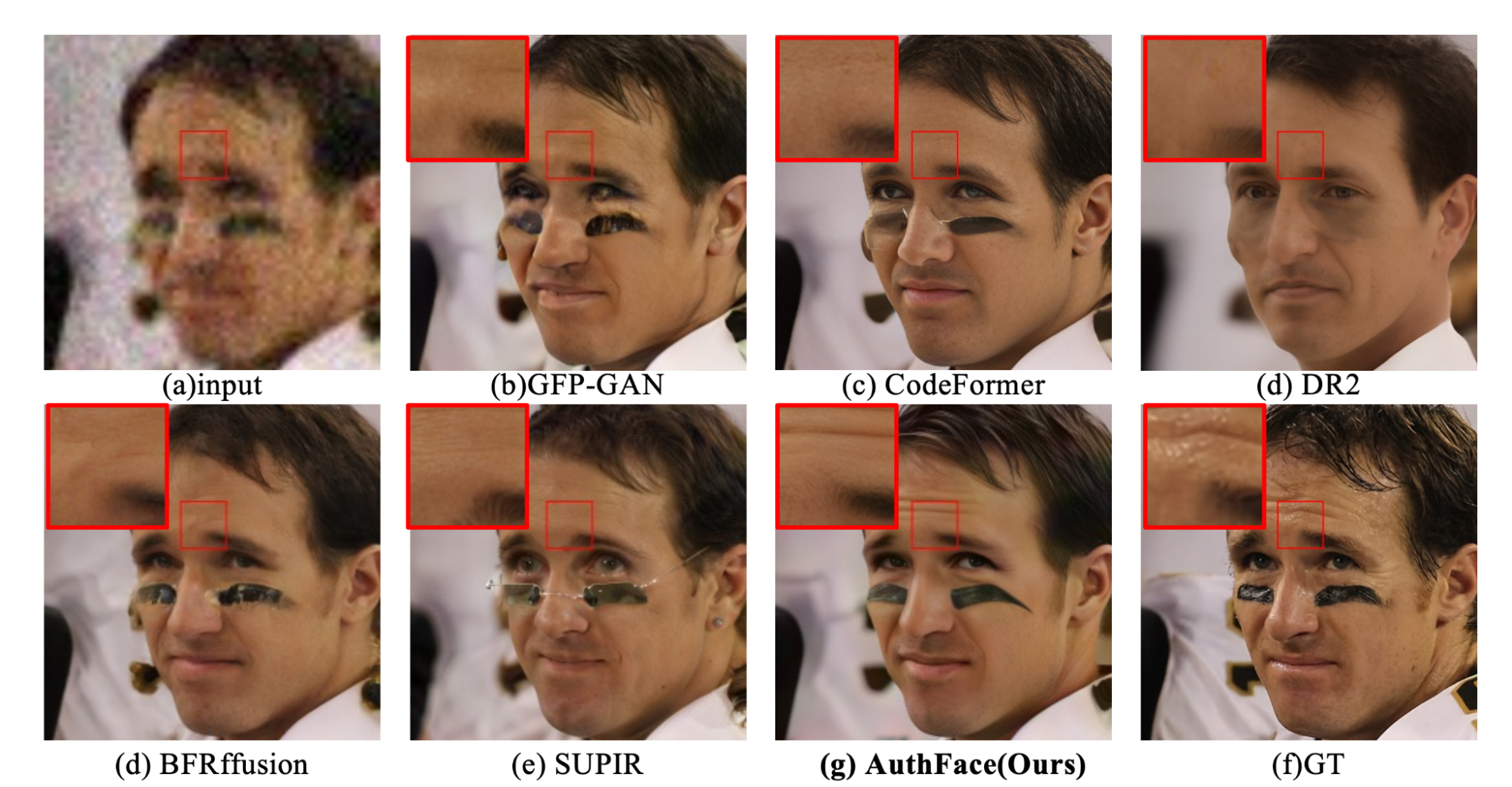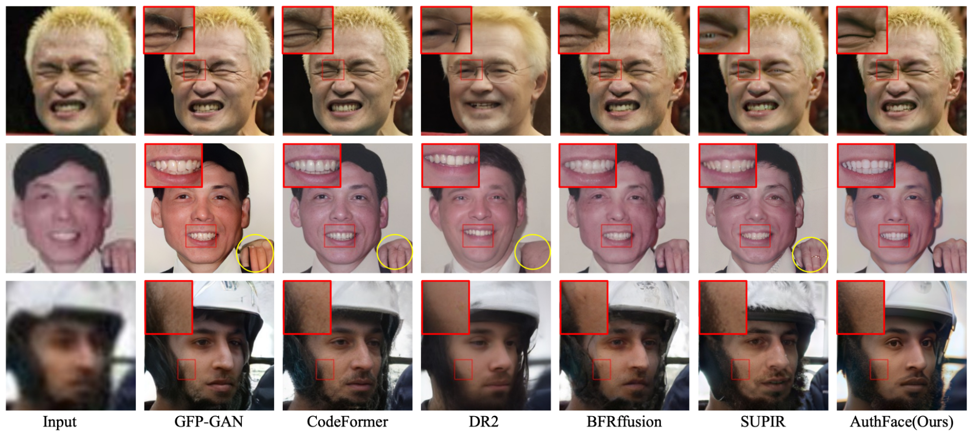 Но в чём причина недовольства? Неужели алгоритм плох? Отнюдь. С технической точки зрения AuthFace — один из лучших в своём классе. На сравнительных иллюстрациях из научной работы хорошо видно: там, где конкурирующие модели (GFP-GAN, CodeFormer, DR2, BFRffusion, SUPIR) выдают откровенные артефакты и деформации, AuthFace показывает весьма достойный результат.