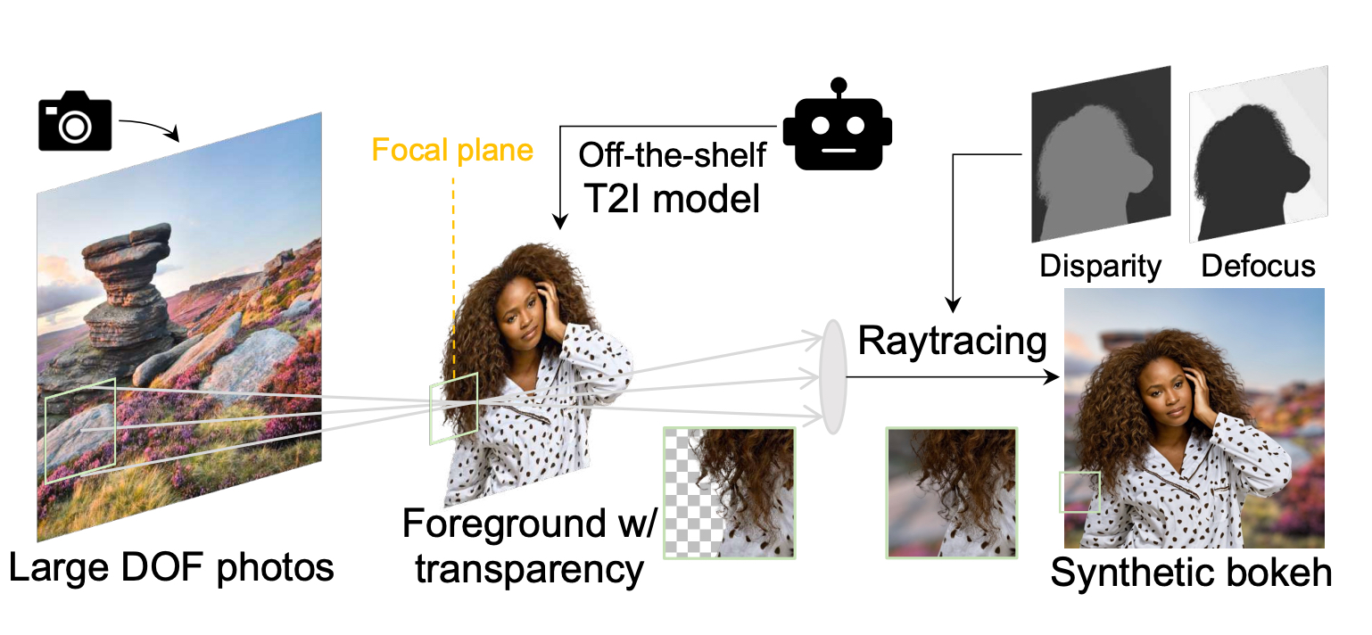 Инженеры Vivo нашли остроумное решение. Раз они и так работают с диффузионными моделями, способными генерировать фотореалистичные изображения, — почему бы не сгенерировать идеальный обучающий датасет? Процесс был устроен следующим образом. Сначала было собрано большое количество реальных, высококачественных фотографий фонов, снятых с максимальной резкостью и глубиной. Затем поверх этих подлинных фонов с помощью диффузионных моделей генерировались фотореалистичные объекты переднего плана: люди, животные, предметы — причём сразу с альфа-каналом, то есть с идеально проработанной прозрачностью и краями. После этого фон размывался физически корректным образом — с учётом точно известных параметров: расстояния до каждого объекта, диафрагмы, фокусного расстояния.