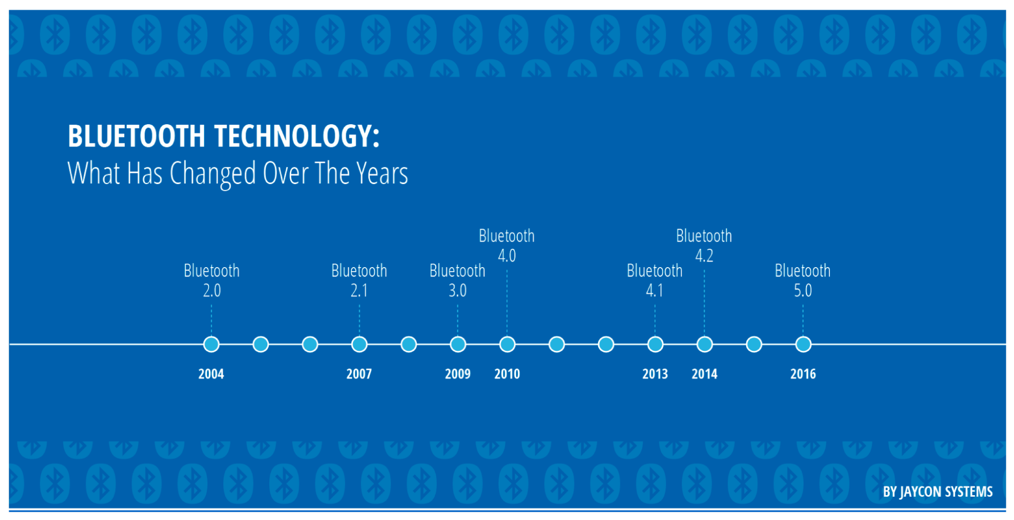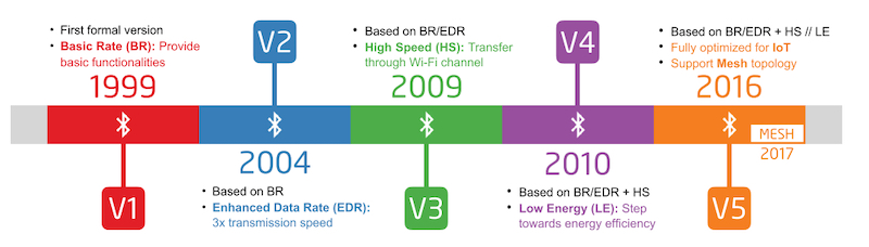 После выхода Bluetooth первой версии в 1999 году появились промежуточные версии 1.1 и 1.2, которые принесли быструю синхронизацию подключённых устройств, уменьшение помех и лучшую совместимость.
