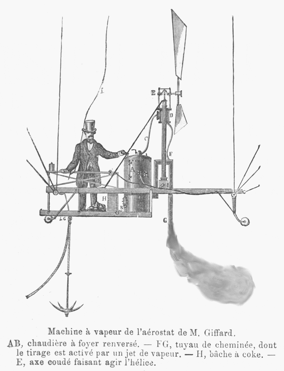 Это был первый случай, когда к воздушному шару прикрепили паровой двигатель. Машина работала на угле, то есть пилот дирижабля одновременно выполнял функции кочегара.