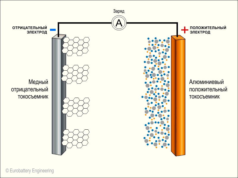 Для этого мы прикладываем к плюсу и минусу батарейки электрический ток с напряжением выше, чем у аккумулятора. Электроны начинают течь обратно от катода и заполняют анод электронами. Что буквально вынуждает положительно заряженные ионы лития вернуться обратно.