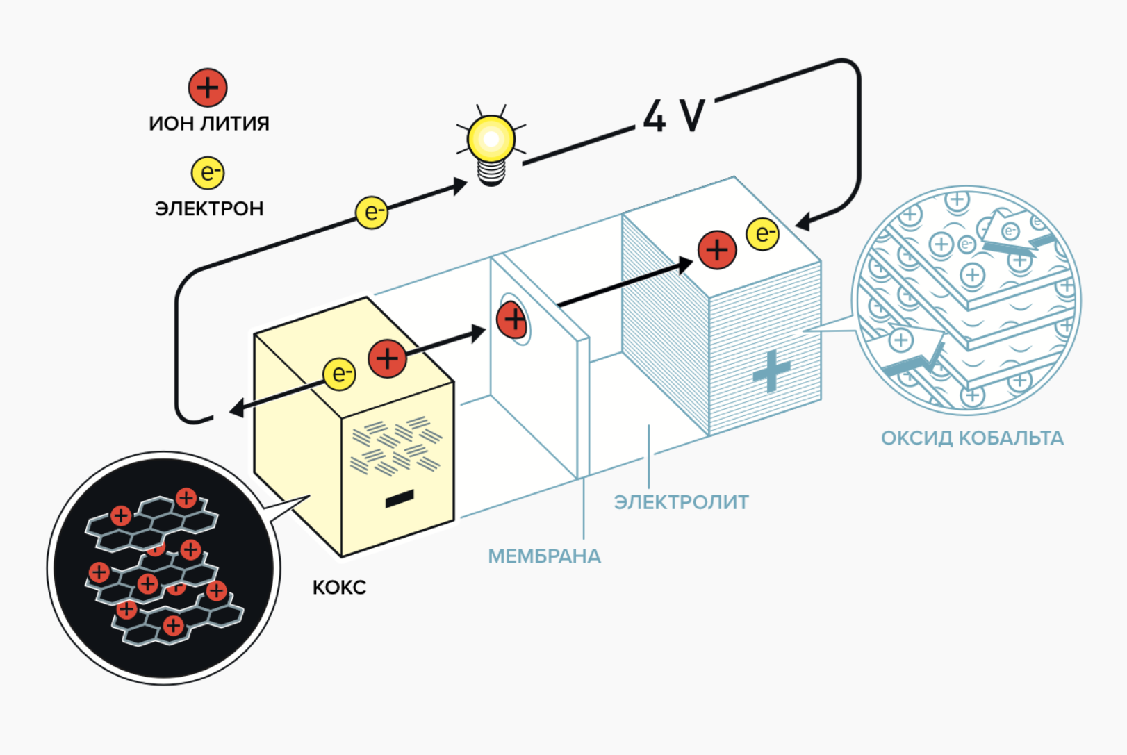 Например, такой же обмен происходит при горении: углерод отдаёт свои электроны более «жадному» до них кислороду, поэтому выделяется энергия в виде тепла. То есть по большому счёту аккумулятор — это управляемый костёр, да ещё и с функцией перезарядки. Вот это, понимаем, инновация.